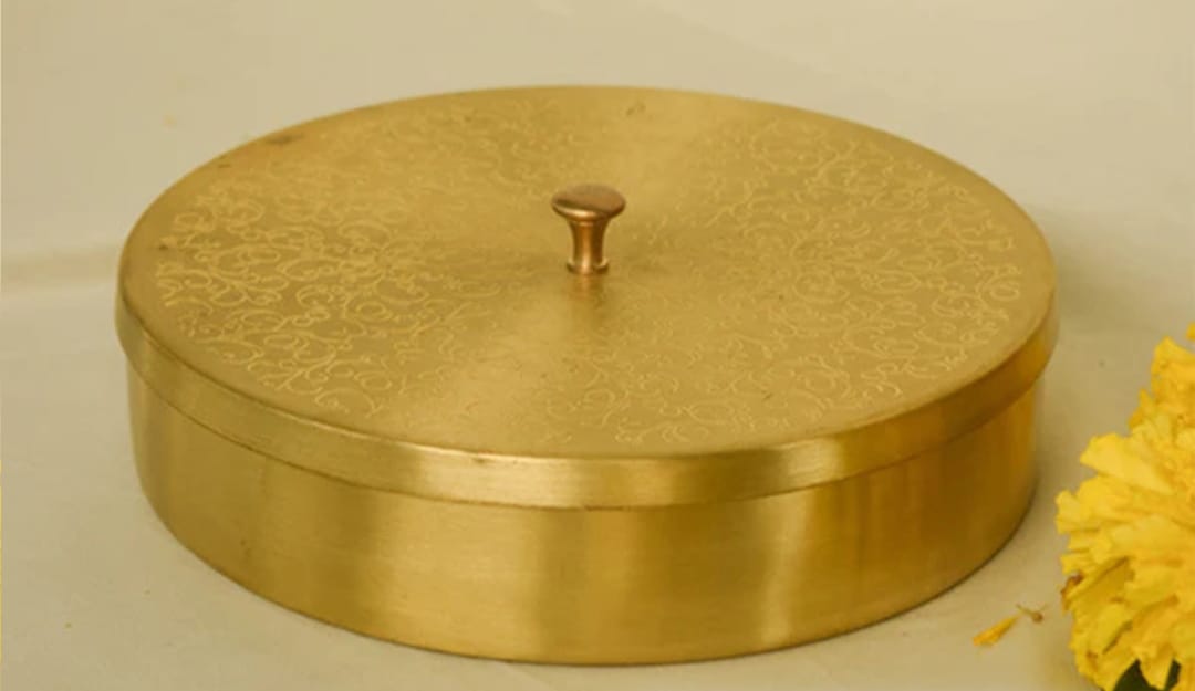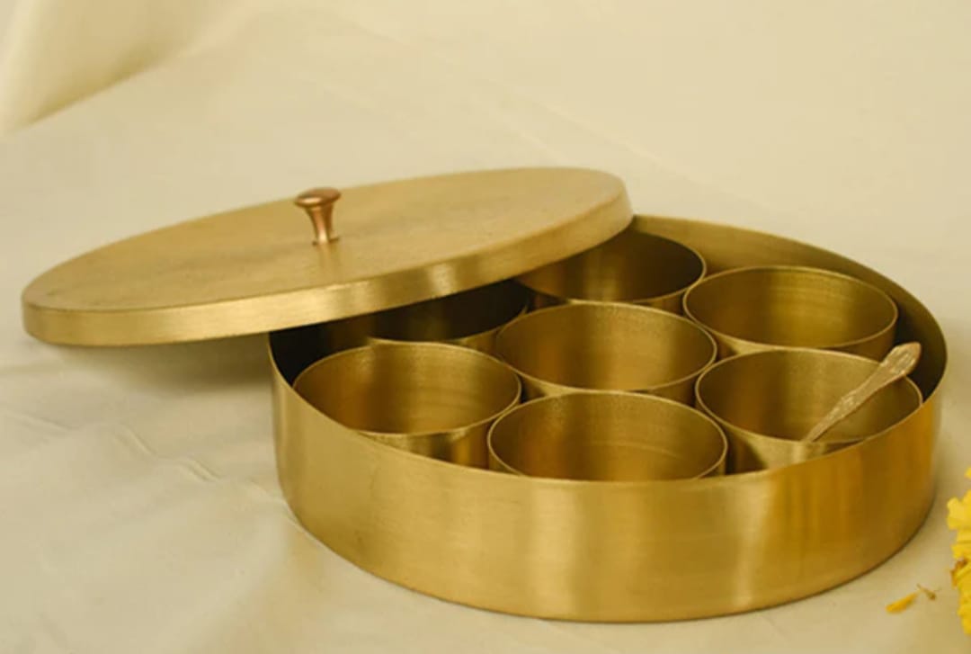 A beautifully crafted brass spice box can also serve as a decorative item in ethnic or rustic-themed kitchens.