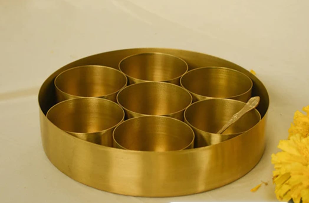 Traditionally called “Masala Dani” or “Masala Dabba,” it is made of brass, a metal alloy consisting primarily of copper and zinc. This makes it not only durable but also beneficial from a health and wellness perspective, according to ancient Ayurvedic principles.